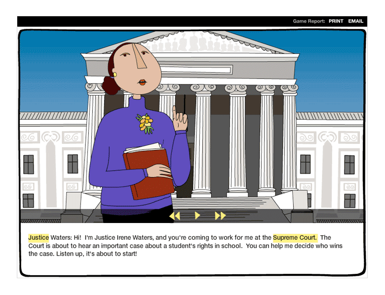 A Sandra Day O'Conner initiative to promote civics education in middle schools with classroom resources and discovery-based learning games. I worked with a team of producers, designers, and illustrators, along with the client team at Georgetown University Law Center to conceptualize, design, and develop an online animated in-classroom game on a First Amendment case.
