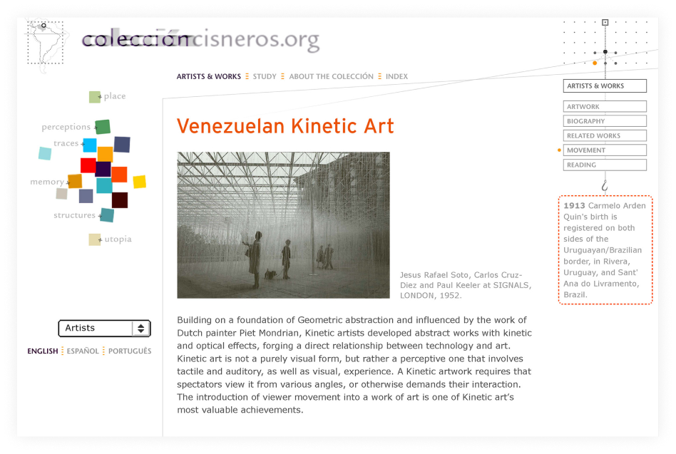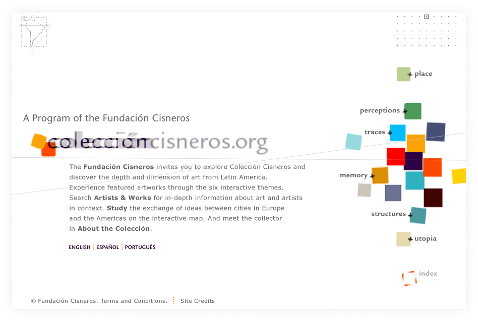 An interactive trilingual website commissioned by the Fundación Cisneros that explores six thematic concepts of 160 works by contemporary Latin American artists.